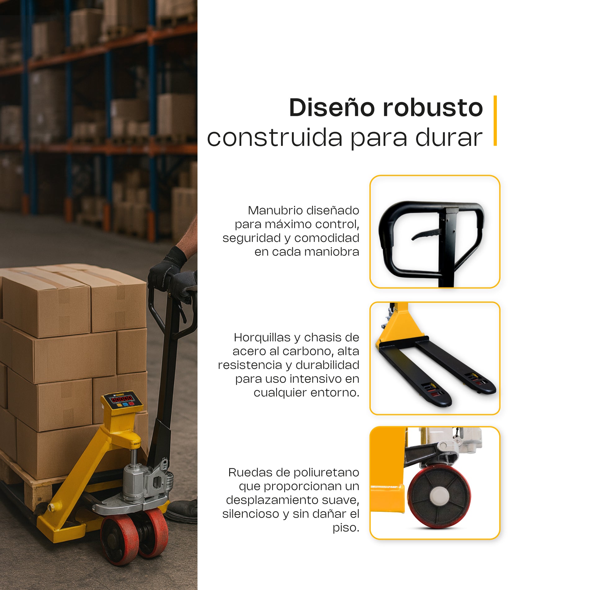 Este patín hidráulico con báscula integrada ofrece una capacidad de carga de hasta 2 toneladas, facilitando el levantamiento y transporte eficiente de cargas pesadas. Su diseño robusto y preciso sistema de pesaje aseguran mayor control y seguridad en sus operaciones, optimizando tiempos y reduciendo esfuerzos en el manejo de mercancías voluminosas. Ideal para entornos industriales y logísticos que requieren precisión y resistencia en cada movimiento.